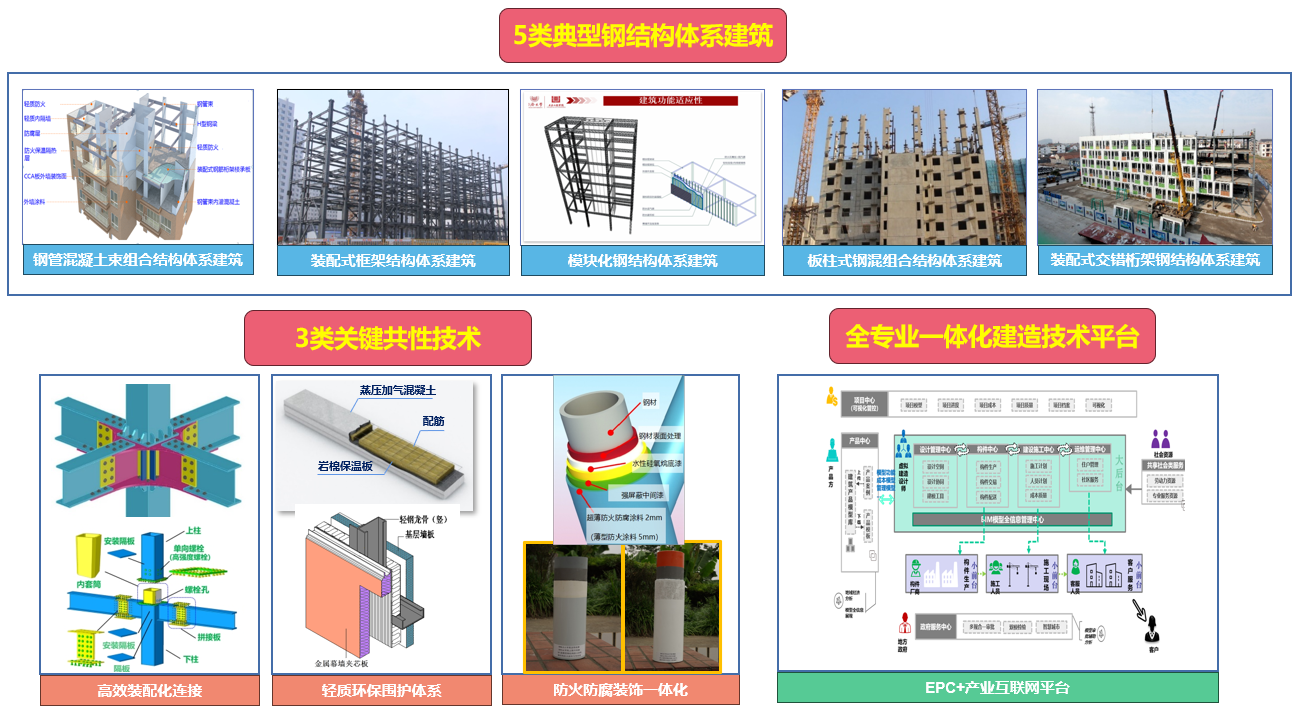 (1)鋼結構建筑產業化關鍵技術:研發了剪力墻、框架、模塊化、板柱結構和交錯桁架等5類典型鋼結構體系建筑產業化集成技術,重點突破了鋼結構建筑產業化需重點突破的高效裝配化連接、輕質環保圍護體系、防火防腐裝飾一體化3類關鍵共性技術,開發了全過程、全專業協同一體化智能建造技術平臺。